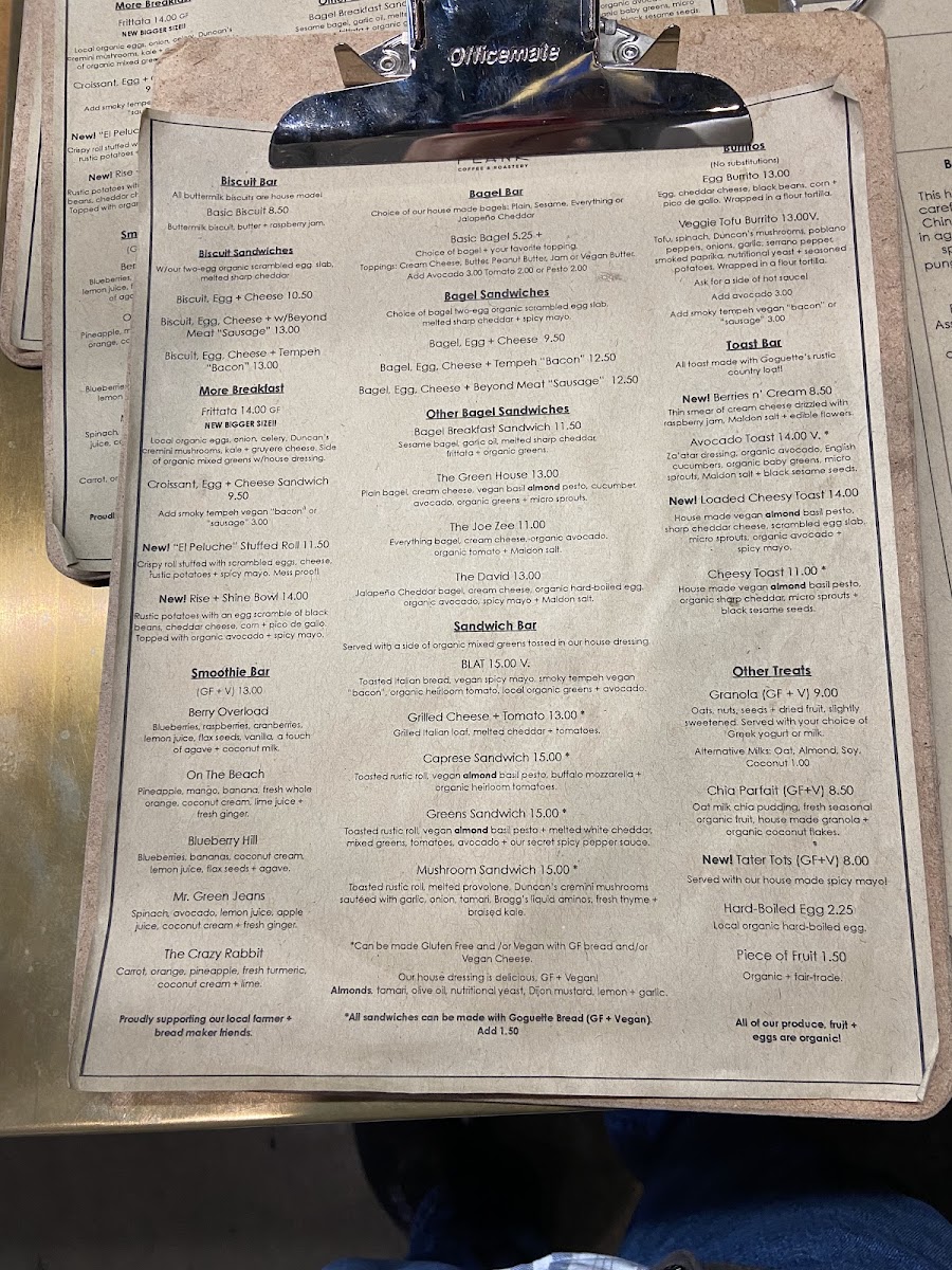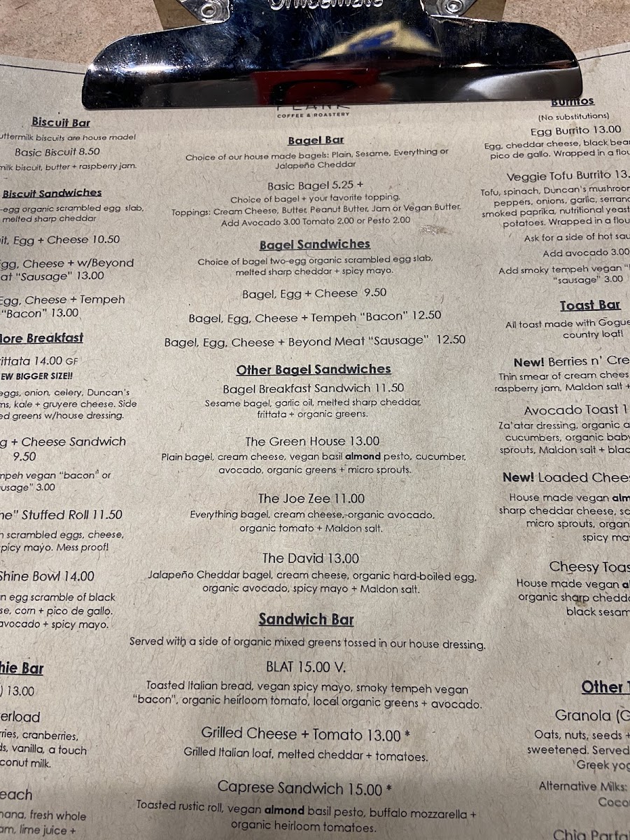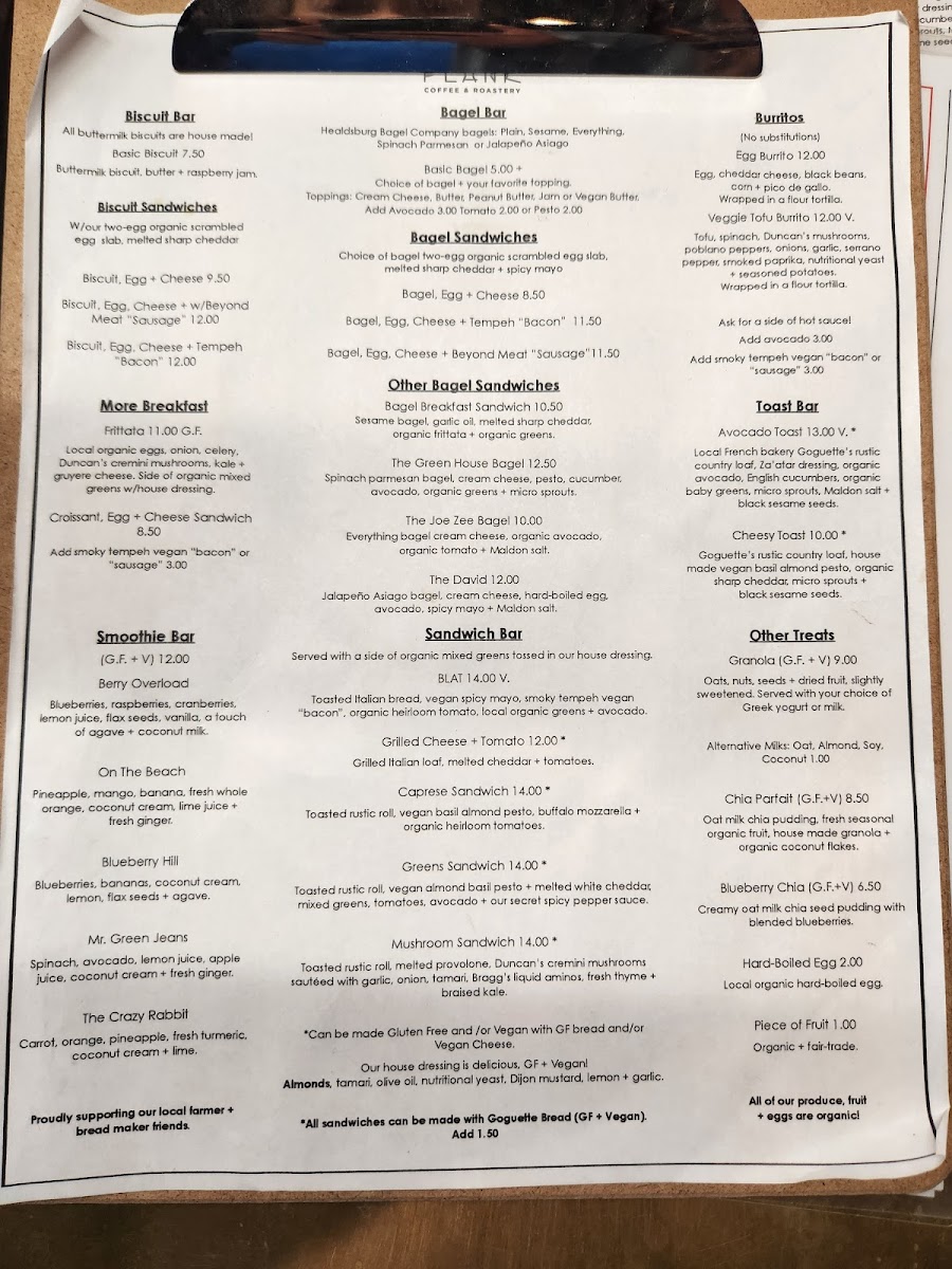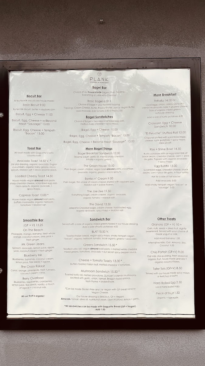 From the moment you step inside, you'll be greeted by an array of enticing aromas wafting through the air. The menu at Plank Coffee features delightful offerings, sure to satisfy any palate. Indulge in their Biscuit Bar, where you can savor the flaky goodness of a Basic Biscuit for just $9, or opt for a hearty Biscuit piled high with Egg and Cheese for $11. For those looking for a meat alternative, try the Biscuit topped with Beyond Meat "Sausage" or Tempeh "Bacon," both available for $13. If you're in the mood for something with a bit more substance, their Egg Burrito at $13 is a popular choice, sure to keep you energized throughout the day.